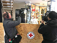 Ein Filmteam des Fernsehsenders SWR3 besucht den DRK-Tafelladen Kirchheim, um über dessen Wiedereröffnung in der Stadtmitte zu berichten.